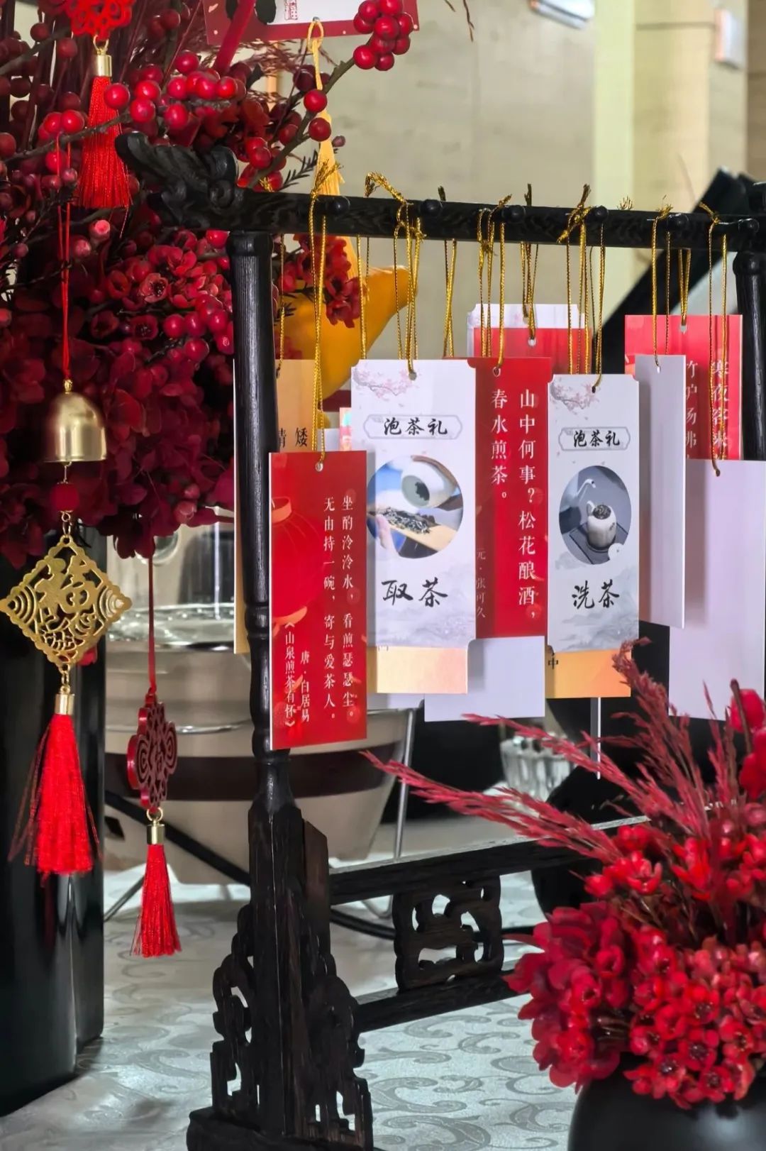 会议中心还创新设计了“心意满满,新春焕彩”主题茶水台,在传统茶饮基础上增加了苹果热橙茶、肉桂苹果茶等种类,摆放了茶文化古诗书签、手写心愿卡,令与会人员在中场休息时既能够润嗓提神,又能品味茶水台的文化气韵。