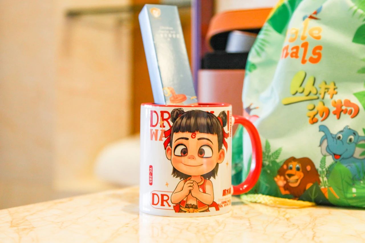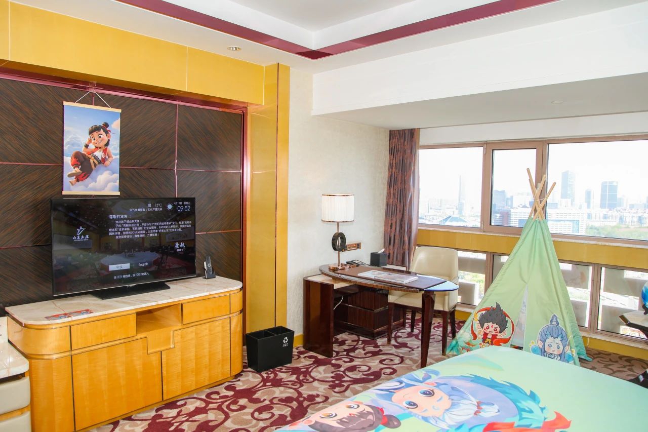 客房推出哪吒主题亲子房。踩上风火轮地垫,钻进乾坤圈帐篷,连拖鞋都变身成三头六臂的小法宝!每一处细节都藏着顽皮童趣,哪吒的冒险场景,还有哪吒抱枕陪伴,让房间变身迷你“哪吒剧场”!