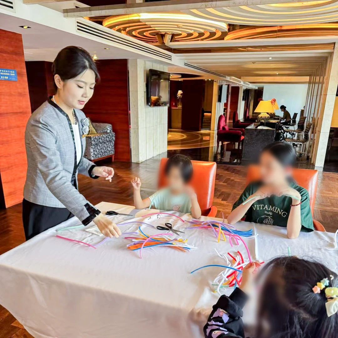前厅名士轩还为住店宾客开设手作工坊亲子活动,亲子可共同制作扭扭棒花束和彩绘石膏娃娃。孩子们完成的作品带回家,将这份泉城记忆永远收藏。