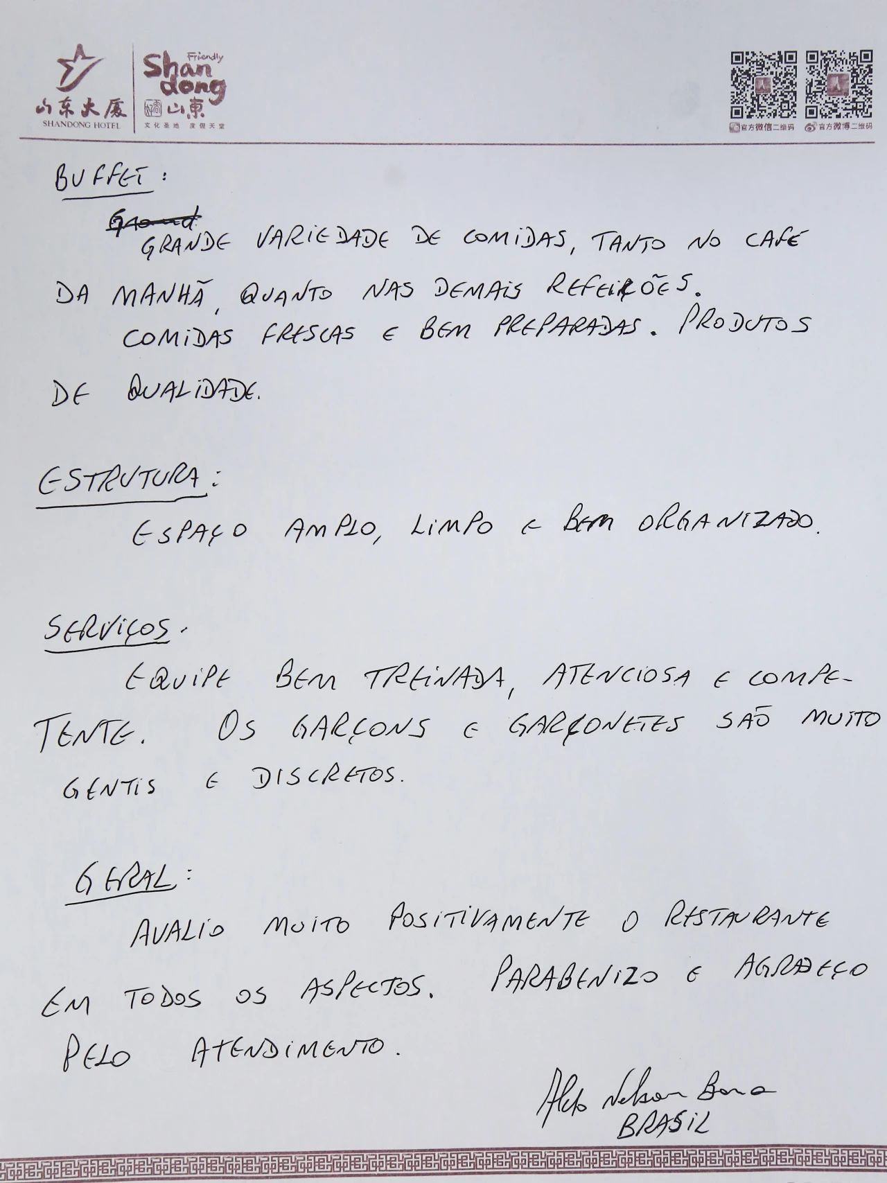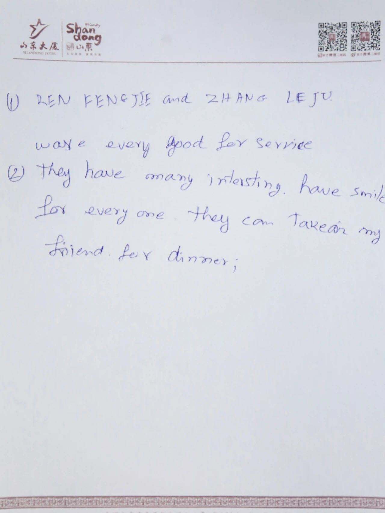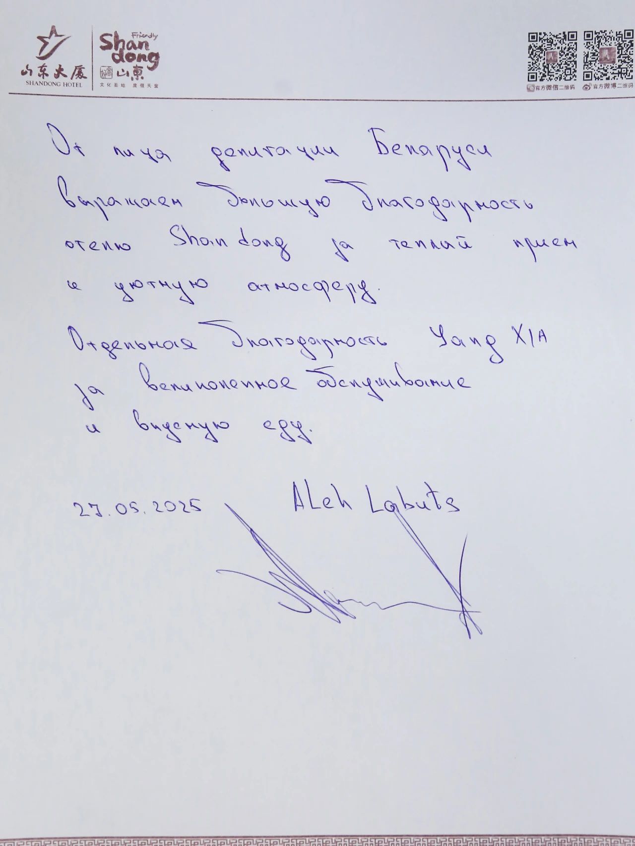 山东大厦累计收到各国嘉宾手写的感谢信近百封,字里行间涌动着对大厦LOVE式服务的高度认可。这些跨越语言的真挚反馈,既是对大厦全体干部员工匠心付出的生动注脚,更是文明互鉴的温暖印记。