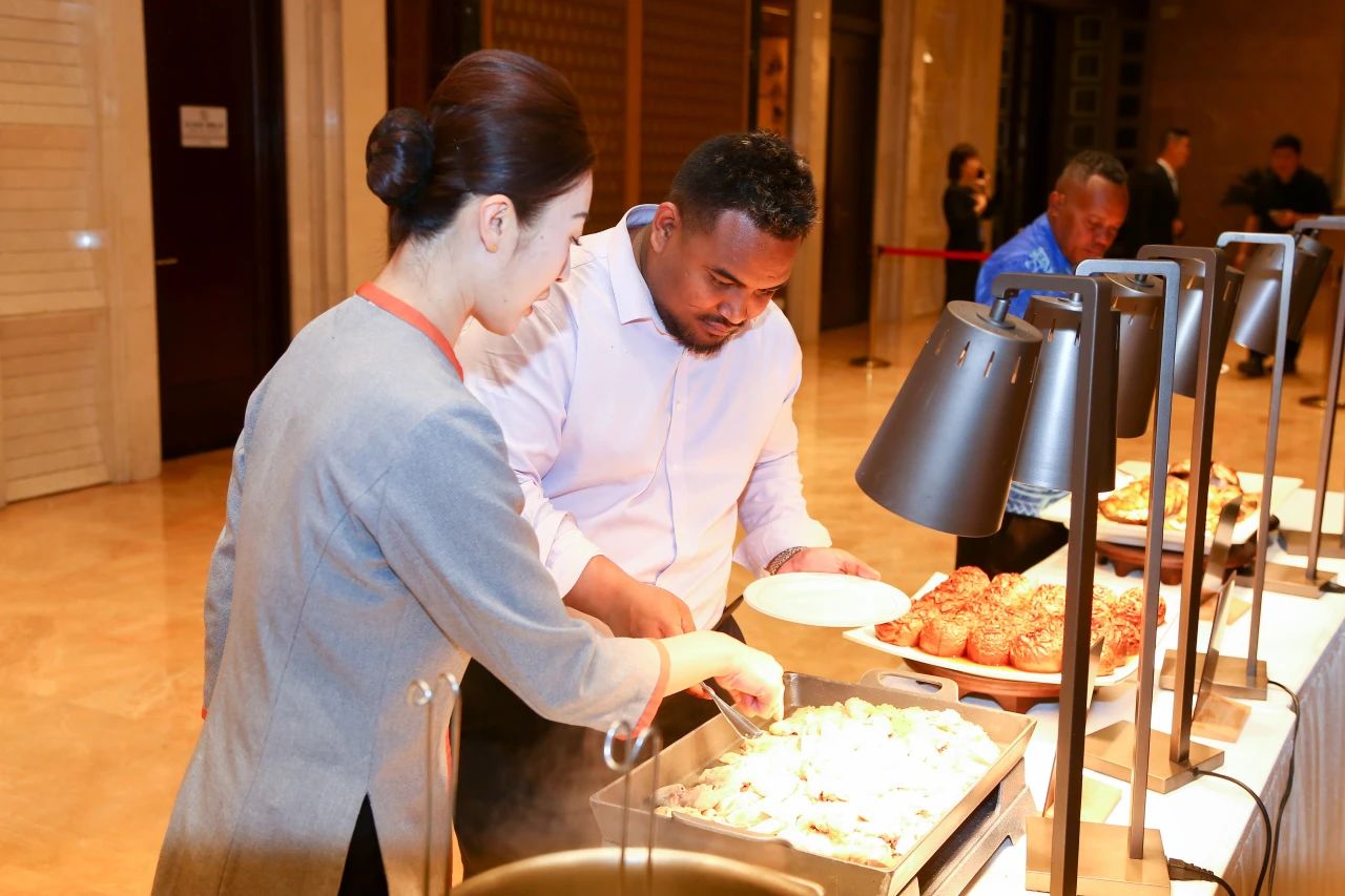 作为味觉外交的主阵地,餐饮部将齐鲁饮食文化与国际餐饮美学巧妙融合,自助餐台化身“流动的山东地图”,16地市特色菜与西式餐品呈环形分布,服务人员用流利的英语讲解,令外宾赞不绝口。