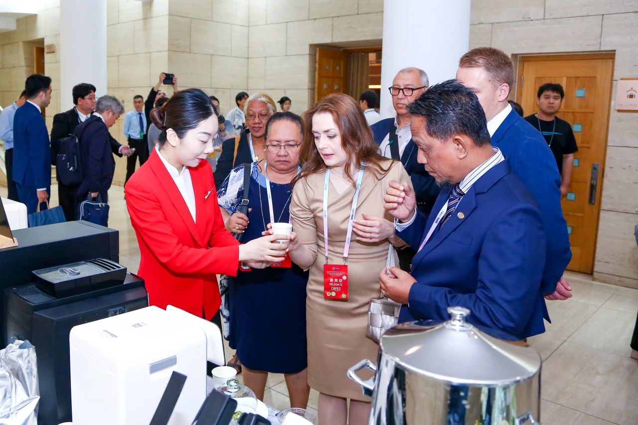 前厅部精心制定接待推进计划,全员投入环境焕新,对嘉宾迎送、入住等环节进行全流程演练,以最佳面貌迎接四海宾朋。根据本次活动的特点与外宾需求,精心组建了专属礼宾、接待、创意策划及一对一贴心服务等多个专项小组,确保各项工作顺畅高效。匠心打造“荷韵”主题迎宾茶水台,巧妙融入山东特色非遗元素并辅以双语介绍,让外宾甫抵大厦便沉浸于浓厚的齐鲁文化氛围之中。
