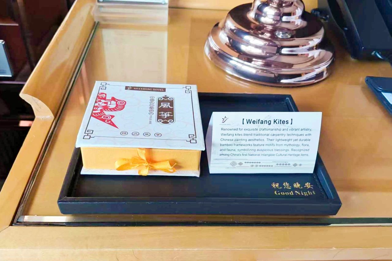 客房是宾客的 “第二故乡”,客房部积极创新,为嘉宾精心准备了潍坊风筝纪念品;精心选择了烟台富士苹果,并配备了中英文营养价值说明卡;还用明湖盖杯准备了日照绿茶作为欢迎茶,让各国嘉宾感受到浓浓的好客之情。