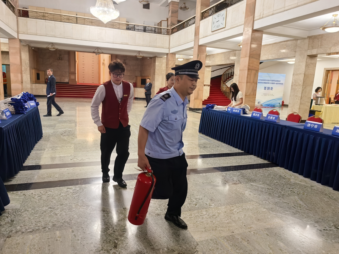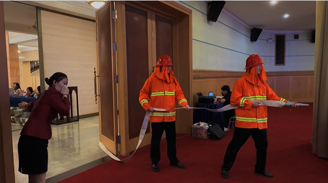 本次演练以“俱乐部一楼礼堂突发火情”为模拟场景,完整复刻真实消防应急响应流程。9时30分,值班人员“发现火情”后,演练正式启动。值班人员精准锁定火源位置,立即上报管理人员及保安部,同步启动紧急疏散预案:迅速取用就近灭火器展开初期扑救;俱乐部应急小组快速穿戴防火装备,启用消火栓投入灭火作业,并引导“受困人员”用湿毛巾捂住口鼻、弯腰沿疏散通道有序撤离。保安部同步调派消防小组携专业器材驰援现场,协同开展灭火与疏散工作。各环节分工明确、响应迅捷、衔接紧密,10分钟内即完成全员疏散及初期火情压制。